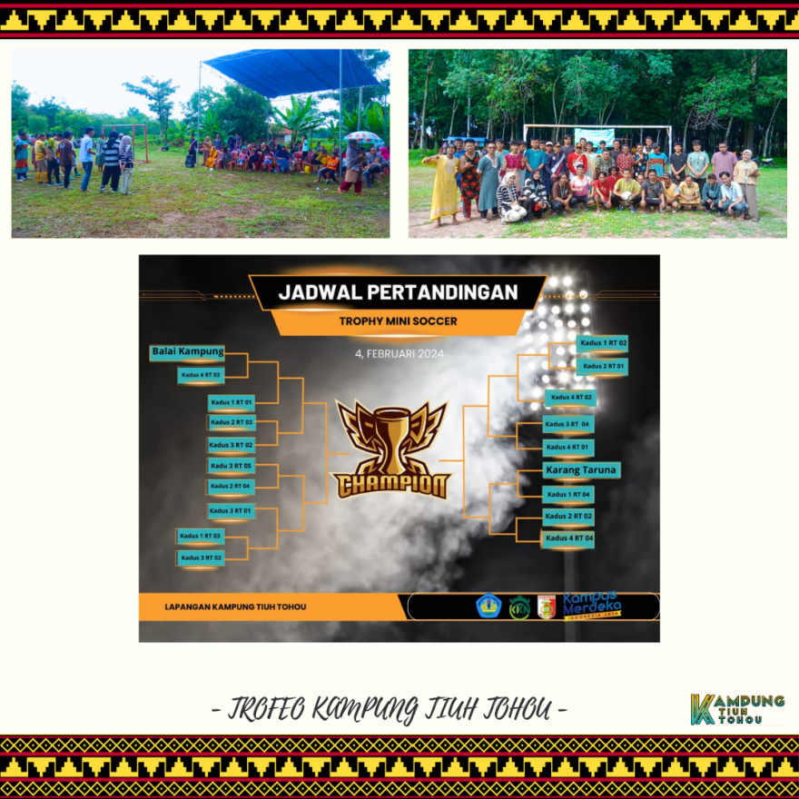 Mahasiswa KKN Unila mengadakan Kompetisi Trofeo di Lapangan Kampung Tiuh Tohou berkolaborasi bersama Aparatur Desa, Karang Taruna dan Warga Setempat. Kegiatan ini diikut sertakan dari perwakilan setiap Rukun Tetangga (RT) masing-masing berjumlah 19 TIM, kegiatan ini berlangsung dengan baik dan lancar, dengan adanya kegiatan ini bisa membangkitkan semangat kepada warga dan terkhususkan generasi muda, ucap Bp. Abdurohim Kepala Kampung Tiuh Tohou.