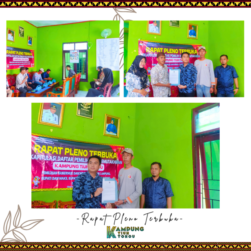 Rapat Pleno Terbuka Rekapitulasi Daftar Hasil Pemutakhiran (DPHP) Kampung Tiuh Tohou merupakan kegiatan penting yang diselenggarakan untuk memastikan keakuratan data pemilih menjelang Pemilihan Kepala Daerah (Pilkada) 2024. Dalam rapat ini, dilakukan rekapitulasi dan validasi daftar pemilih hasil pemutakhiran yang telah dilakukan oleh Petugas Pemutakhiran Data Pemilih (Pantarlih), Panitia Pemungutan Suara (PPS), dan Badan Pengawas Kampung (BPK). Kegiatan ini berlangsung di Balai Desa Kampung Tiuh Tohou, sebuah lokasi yang menjadi pusat administrasi dan kegiatan masyarakat kampung.