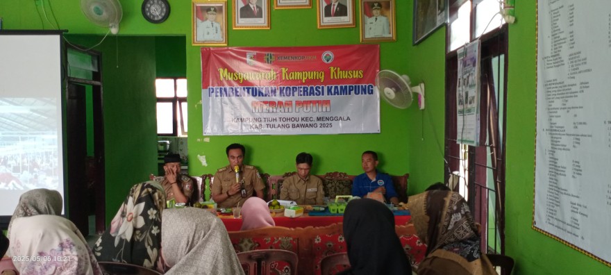 Tiuh Tohou, 6 Mei 2025 — Kepala Kampung Tiuh Tohou, Bapak Abdurohim, memimpin langsung musyawarah kampung khusus dalam rangka pembentukan Koperasi Merah Putih sebagai tindak lanjut atas Instruksi Presiden Republik Indonesia terkait pembentukan Koperasi Desa di seluruh Indonesia.